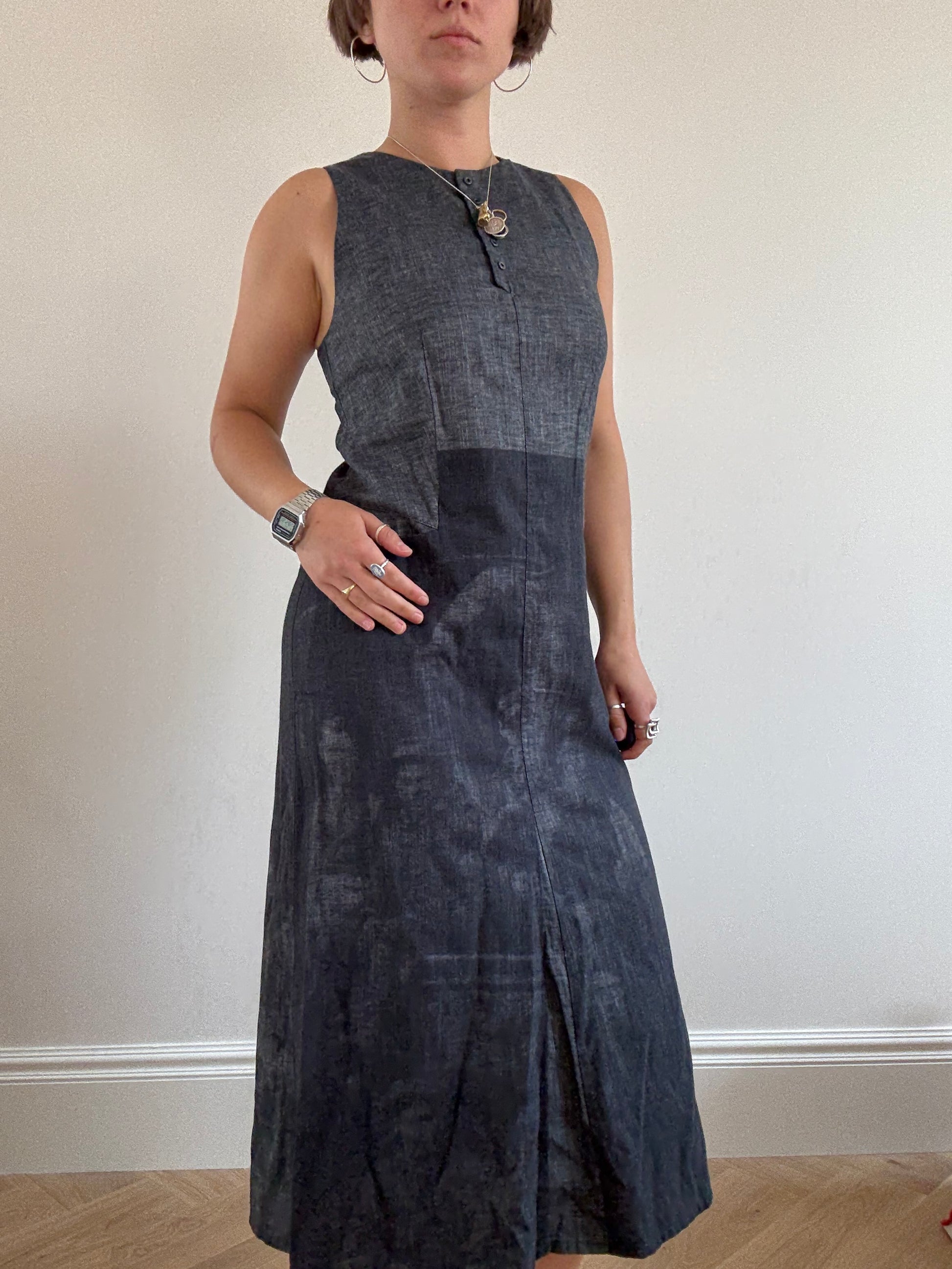 Maxi length with button up detailing on neckline and subtle vintage photograph print on skirt