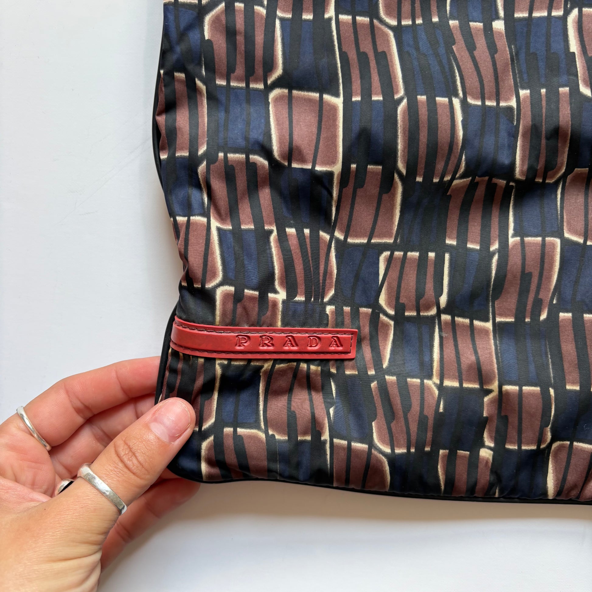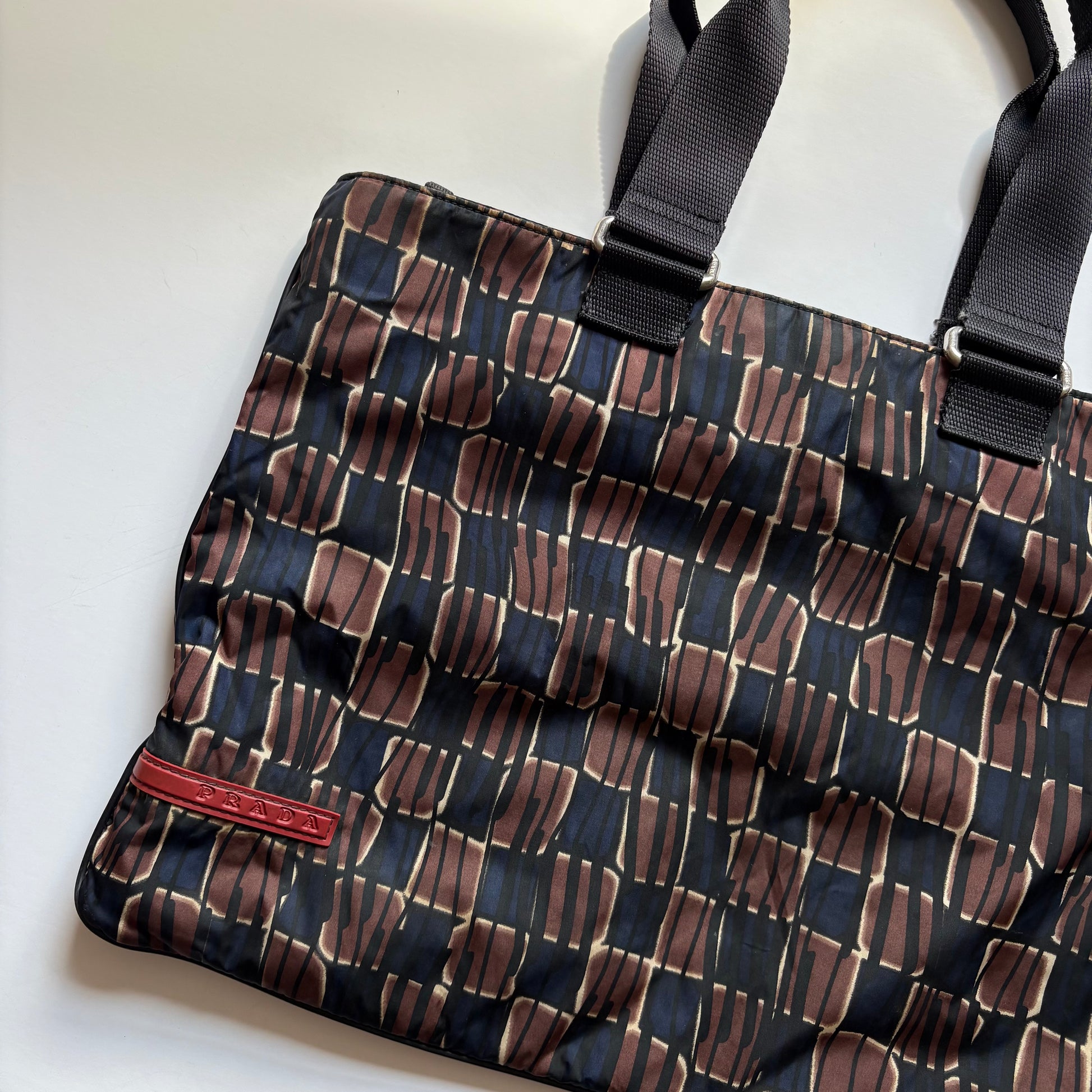 Vintage Prada sport handbag with retro geometric brown and blue print.